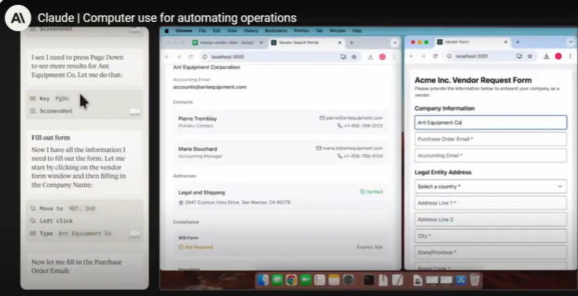 Anthropic은 Claude가 화면을 보고 소프트웨어 도구를 사용해 작업을 수행할 수 있도록 훈련되었으며, 사용자가 원하는 작업을 자동화할 수 있도록 컴퓨터 명령을 처리한다고 설명했다. 개발자들은 Anthropic의 API, Amazon Bedrock, Google Cloud의 Vertex AI 플랫폼을 통해 이 기능을 테스트할 수 있다.