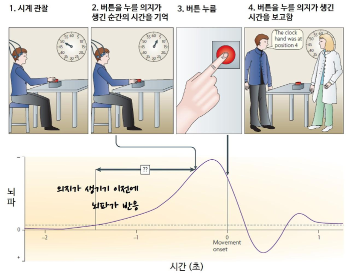 레디니스 포텐셜: 참가자들이 손목을 움직이기로 의식적으로 결정하기 약 500ms 전에 이미 뇌에서 준비 신호가 발생하는 것을 발견했다.