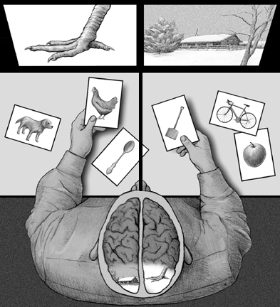 장면 실험에서 환자의 왼쪽 시야에는 눈보라의 이미지를, 오른쪽 시야에는 닭의 이미지를 보여주었다. 이 이미지와 관련된 사진을 고르라고 지시했을 때, 환자는 왼쪽 손으로 삽을, 오른쪽 손으로는 닭장의 사진을 골랐다. 이것은 왼쪽 시야와 왼쪽 손을 담당하는 우뇌가 ‘눈’을 보고 ‘삽’을 연상했기 때문이고, 오른쪽 시야와 오른쪽 손을 담당하는 좌뇌가 ‘닭’을 보고 ‘닭장’을 연상했기 때문이다.
