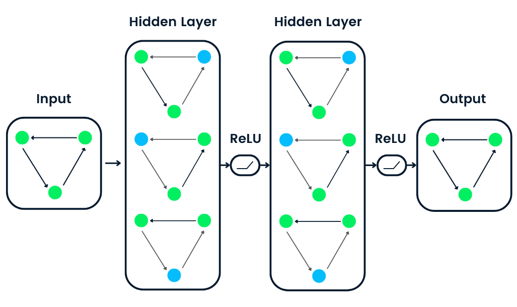 - 메시지 전달 네트워크(Message Passing Network): GNN은 노드 간의 메시지 전달을 통해 정보를 업데이트하는 구조를 가진다. 이는 그래프에서의 관계와 상호작용을 학습하는 핵심 메커니즘이다.