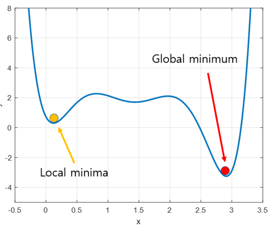 - 국소 최소값(Local Minima): 비록 경사하강법이 함수의 최소값을 찾도록 설계되었지만, 여러 국소 최소값이 존재하는 함수에서는 전역 최소값(Global Minimum)이 아닌 국소 최소값에 수렴할 수 있다.