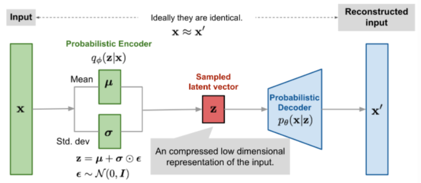 - 일반적인 Autoencoder에서는 잠재 벡터가 고정된 값으로 변환되지만, VAE에서는 이 잠재 벡터를 확률 분포(보통 정규분포)로 모델링한다. 즉, 각 데이터 포인트는 잠재 공간에서의 평균과 분산으로 표현된다.