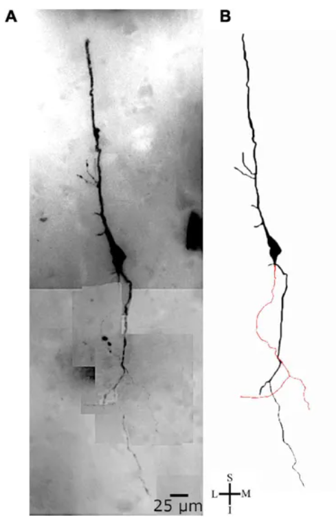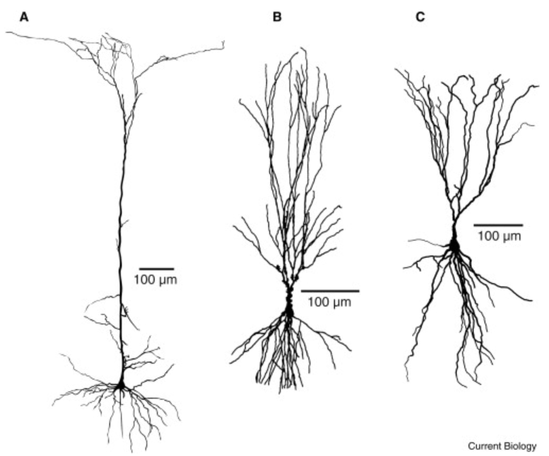 - 수상돌기(Dendrites): 피라미드 뉴런은 하나의 긴 기저 수상돌기(basal dendrite)와 하나의 긴 수상돌기(apical dendrite)를 가지고 있다. 이 수상돌기들은 뉴런으로 들어오는 신호를 수용하는 역할을 한다. 특히, apical dendrite는 뉴런의 상부에서 길게 뻗어나가며 다른 층과 상호작용한다.